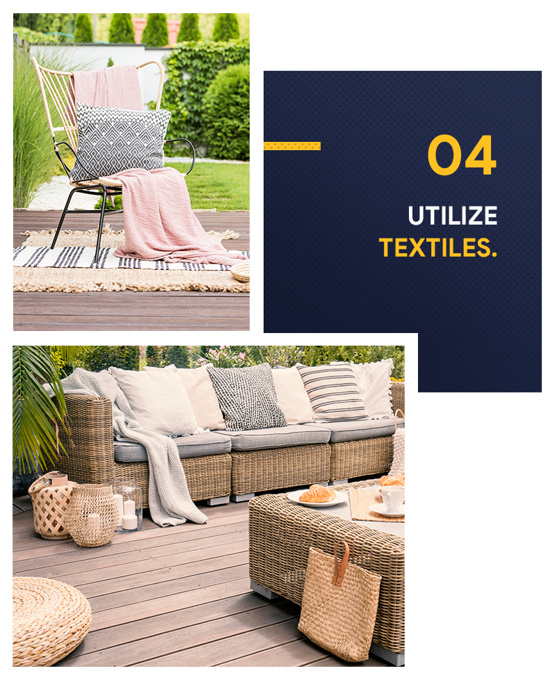 Adding textiles, such as rugs and fabrics, is an affordable update you can make to enhance texture and complement the color scheme of your outdoor space. You can also add new accent pillows, cozy floor cushions, and slipcovers to reinvigorate the area. When designing exposed spaces, remember to always check for inclement weather to make sure that any items that could get damaged make their way into storage. When possible, choose outdoor fabrics that can withstand the sun's rays and also dry quickly once weathered.